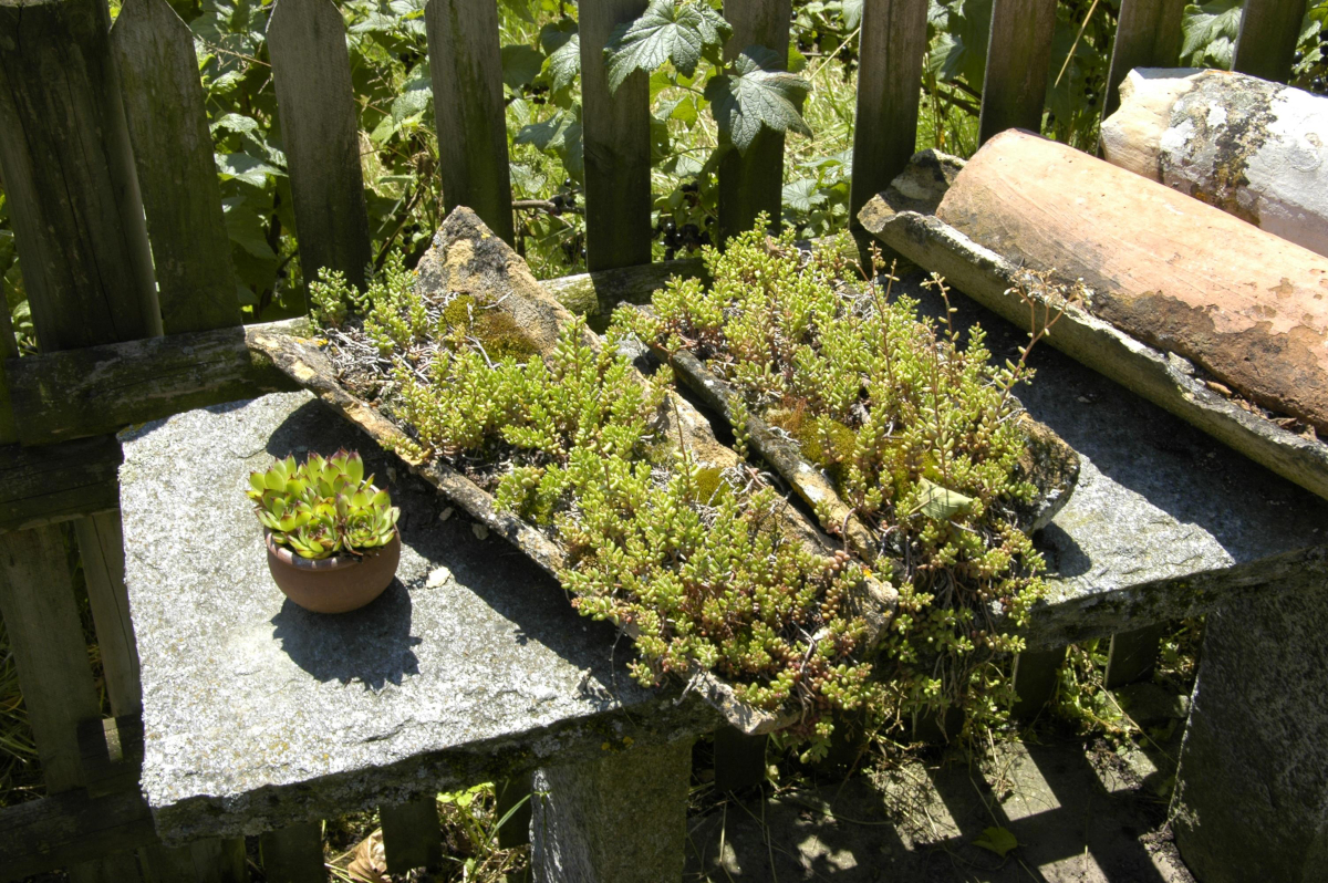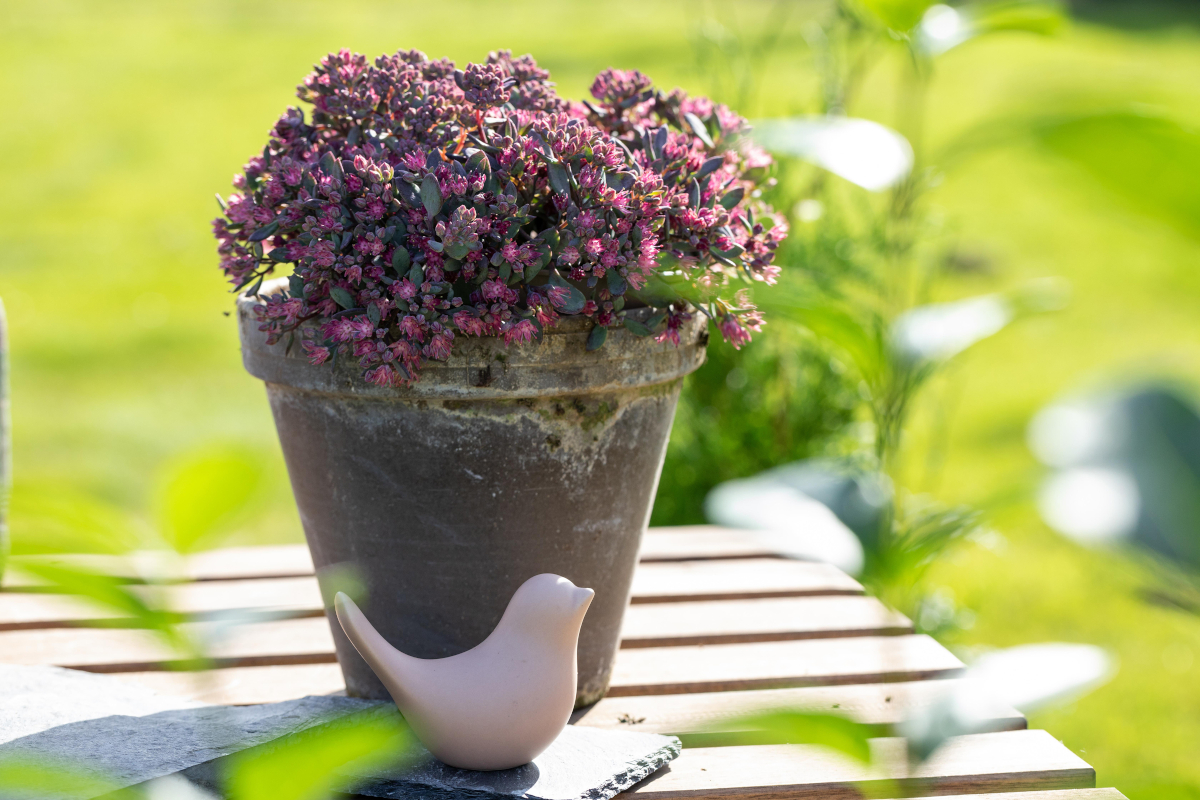 Sedum lässt sich perfekt zum Dekorieren im Herbst nutzen. So eignet sich die hohe Fetthenne mit ihren zahlreichen dicht besetzten und kräftig gefärbten Blüten zum Beispiel perfekt für die Vase: Die geraden Blütentriebe lassen sich gut schneiden und bleiben lange schön. Mauerpfeffer und Tripmadam wiederum sind unkomplizierte Pflanzen für kreative Arrangements: Sie benötigen nur ein sehr geringes Erdvolumen, dadurch kann man mit ihnen auch flache Pflanztöpfe gestalten. Besonders spannend sind dabei zweckentfremdete Gefäße, von Tellern und Schalen bis zu umgedrehten Dachziegeln. Diese Dekoration hält das ganze Jahr: Als wintergrüne Pflanze sieht Mauerpfeffer auf dem Tisch oder Balkon auch dann noch gut aus, wenn es kälter und dunkler wird.