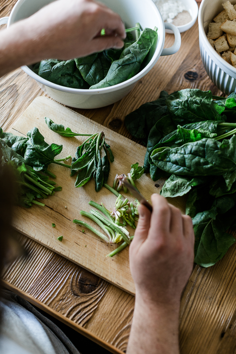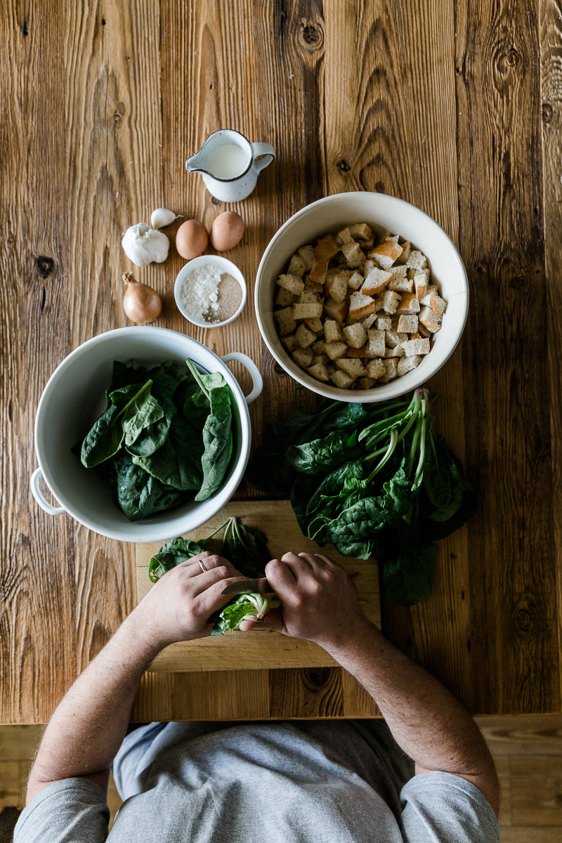 Zunächst die Weizenbrötchen in etwa 2 x 2 cm große Würfel schneiden und mit der Milch übergießen. Den Spinat gründlich putzen, abtropfen lassen und vom Strunk befreien.