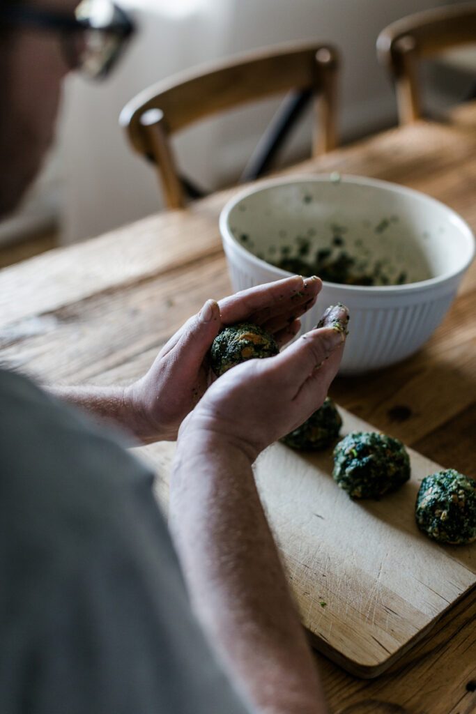Jetzt die Eier und den etwas abgekühlten Spinat zu den Brotwürfeln geben, kräftig mit Salz, frisch gemahlenem Pfeffer und Muskat würzen und mit den Händen gut vermischen. Zum Schluss noch das Mehl und die Semmelbrösel zugeben und aus der Masse 12 kleine Knödel formen.