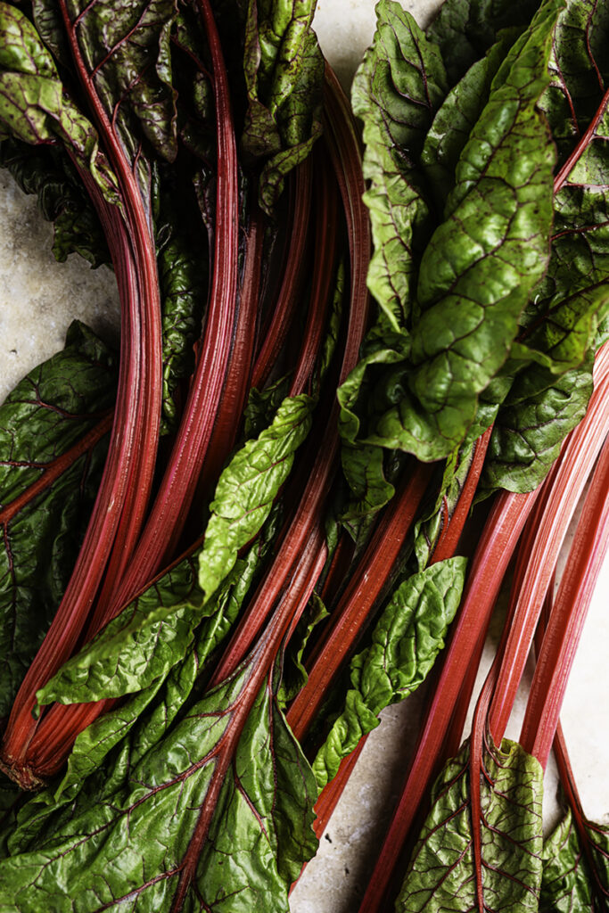 Mangold ist im Geschmack kräftiger. Auch wenn seine Blätter an Spinat erinnern, schmecken sie doch würziger. Seine Stiele bringen leuchtend rot, gelb oder orange zusätzlich Farbe ins Spiel. Klassisch findet man ihn in der mediterranen Küche – in Gratins, Quiches, gefüllten Teigrollen oder als Mangoldgemüse mit Knoblauch und Olivenöl. Beliebt ist er heute auch in Shakshuka-Varianten, als Füllung im Pfannkuchen, im Ofengemüse oder zur Pasta.