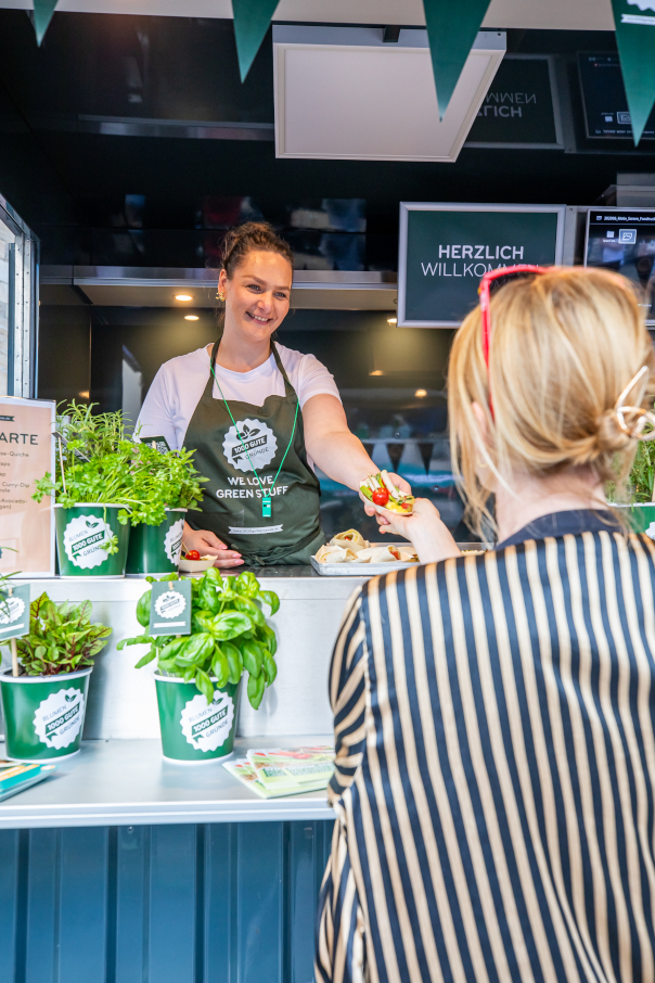 Wer sich in und rund um den „Gänse Markt“ zum gemeinsamen Fußball-Gucken versammelt hatte, konnte das „1000 gute Gründe“-Team kaum übersehen. Der Foodtruck der Initiative sorgte schon vor Spiel-Anpfiff für neugierige Blicke und interessierte Gespräche. Rund 600 leckere Snacks, darunter Gemüse- und Falafel-Wraps, mediterrane Gemüse-Quiche und rustikale Tomate-Mozzarella-Kanapees, wurden im Laufe des Abends an die Feiernden verteilt. Gegen Vorlage eines Coupons konnten die Besucher einen der herzhaften Gemüse-Snacks probieren, die eine optimale Ergänzung zum „Stadionbier“ boten.