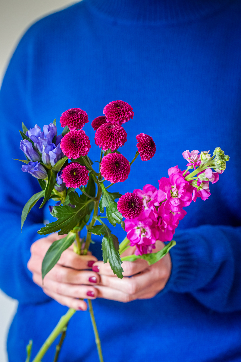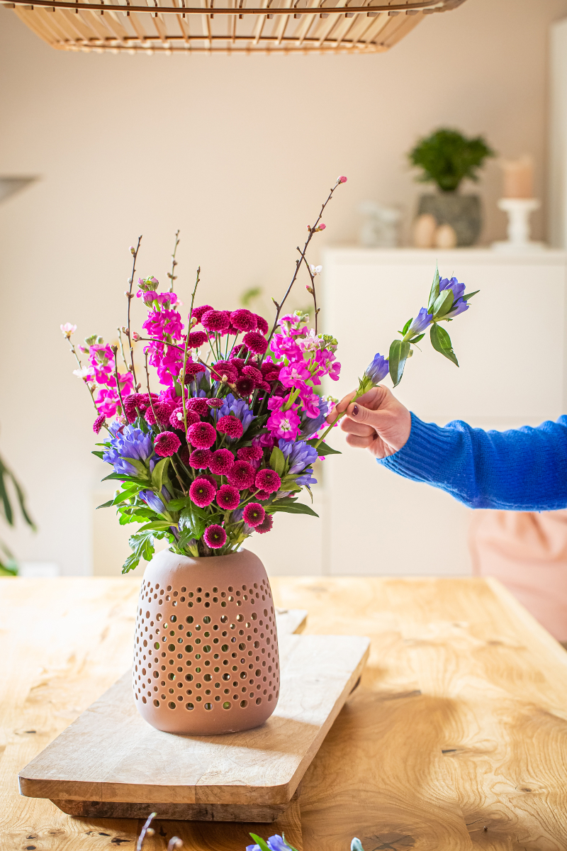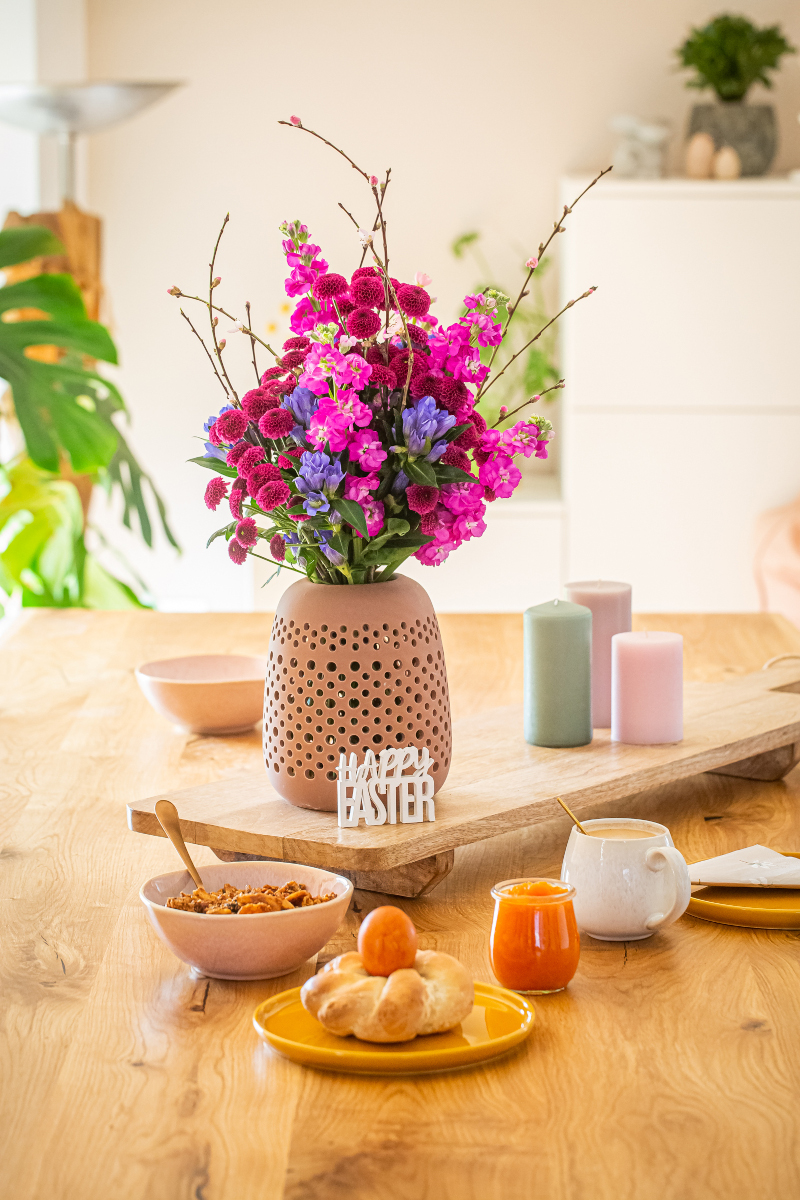 Apropos Dekoration: Was bei einer festlichen Ostertafel keinesfalls fehlen darf, sind frische Blumen. Zu diesem Anlass greift man gerne auf die klassischen Frühlingsblüher in Gelb zurück, aber für den Start in die Blütensaison darf es auch gerne mal kräftiger sein. Zum Beispiel inspiriert vom Color-Blocking aus der Mode: Dabei werden kontrastreiche Farben harmonisch miteinander kombiniert. Ein Strauß in leuchtendem Blau, Violett und Pink lässt sich ganz einfach zusammenstellen und belebt jeden Tisch.