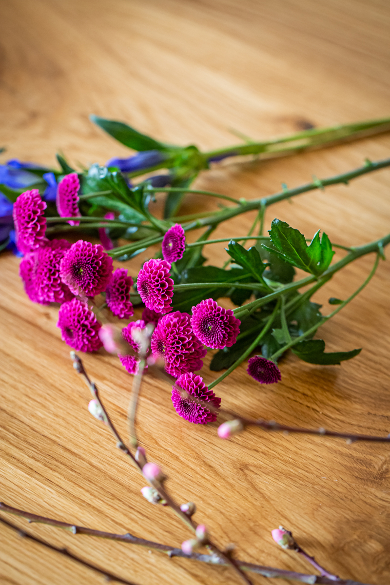 Die Blumen am besten so arrangieren, dass immer etwas Abwechslung im Strauß ist, zwischendurch ein paar der Pfirsichzweige einarbeiten.