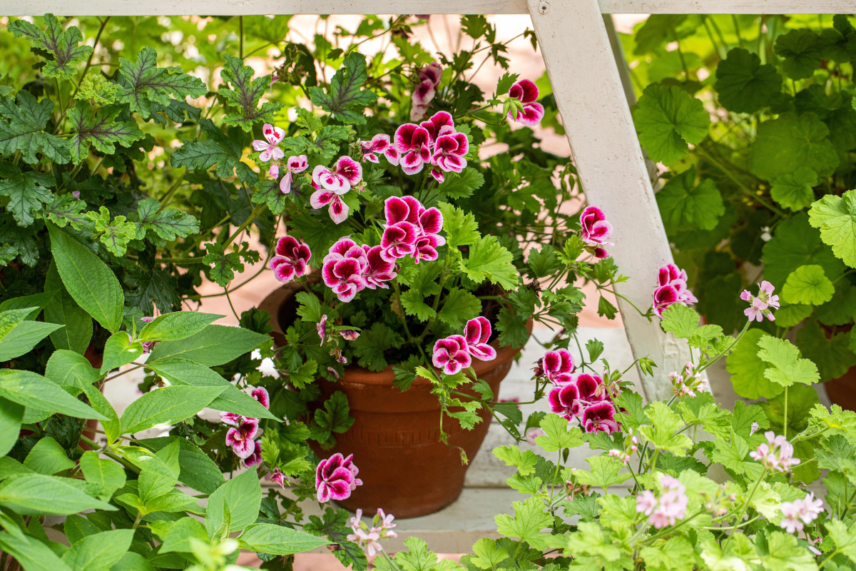 Die meisten klassischen Balkonpflanzen für sonnige Standorte sind gute Partner, unter anderem Verbenen, Fächerblumen, Elfenspiegel oder Schneeflockenblumen. Mediterran wird der Look von Geranien zusammen mit Kräutern wie Salbei, Rosmarin oder Lavendel. Diese haben ähnliche Ansprüche an Standort und Pflege wie die wärmeliebende Geranie, und mit ihren grauen, teilweise schmalen Blättern ergänzen sie die üppigen Blüten perfekt. Ebenso stimmungsvoll: Einzelne rote Geranien im Terrakottatopf erinnern an südlichere Länder. Für Naturfreunde eignen sich eher Duftgeranien oder die nicht so üppig blühenden „wilden“ Formen, denn sie bieten Bienen und anderen Insekten Nahrung. Klassische Geranien setzen die Tiere dagegen auf Diät, weshalb man sie am besten mit den oben genannten Pflanzpartnern ergänzen sollte. Duftgeranien faszinieren zusätzlich mit ihrem besonderen Duft, ihre Blätter aromatisieren Getränke oder Desserts – dafür dürfen die Pflanzen natürlich nicht mit Schutzmitteln und Ähnlichem behandelt sein. Einige Arten sollen mit ihrem Zitrusduft sogar Mücken abschrecken.