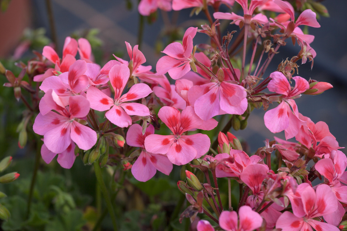 Gerade zu Beginn der Saison um Anfang Mai herum gibt es Geranien oder Pelargonien in großer Auswahl. Die klassischen Zier-Arten wachsen aufrecht oder hängend und blühen in vielen Farben von Weiß über Rosa, Rot bis zu Violett; auch zweifarbige oder gemusterte Sorten sind möglich. Die Zuchtbetriebe bringen hier immer neue attraktive Blüten hervor.