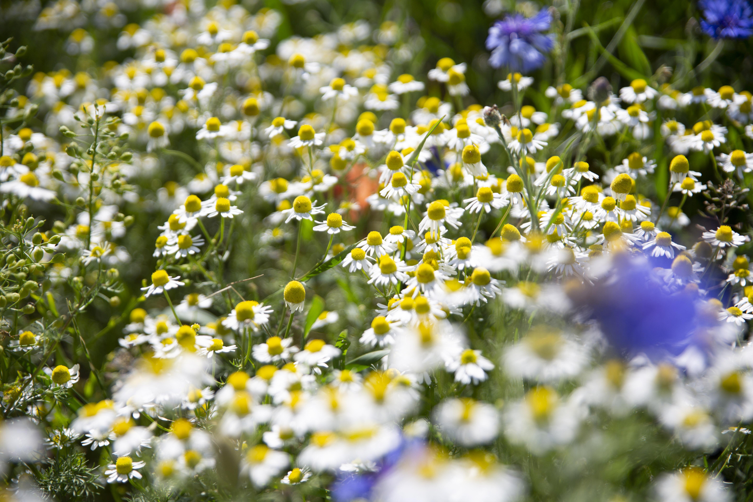 Kamille (Matricaria chamomilla) ist ebenfalls eine traditionelle Heilpflanze. Ihre Blüten haben entzündungshemmende und beruhigende Eigenschaften. Kamillentee gilt als bewährtes Mittel bei leichten Magenproblemen oder Erkältung – bei letzterer auch als wohltuender Aufguss zum Inhalieren. Dazu kann man frisch geerntete oder getrocknete Blüten überbrühen. Im Garten sorgen die typischen weiß-gelben Blüten für einen wiesenhaften Look. Sie lassen sich gut aussähen und gedeihen an sonnigen, warmen Orten mit lockerem, eher trockenem Boden. Beim Pflücken in fremdem Terrain ist übrigens Vorsicht angesagt: Man kann die Echte Kamille leicht mit anderen Pflanzen verwechseln, zum Beispiel mit der giftigen Hundskamille. Am besten verwendet man daher nur Pflanzen aus eigenem Anbau, wenn man sie nicht bei der Apotheke des eigenen Vertrauens bezieht. Normalerweise erkennt man die Echte Kamille am Blütenzentrum: Öffnet man den gelben Blütenkopf, so sollte er innen hohl sein.