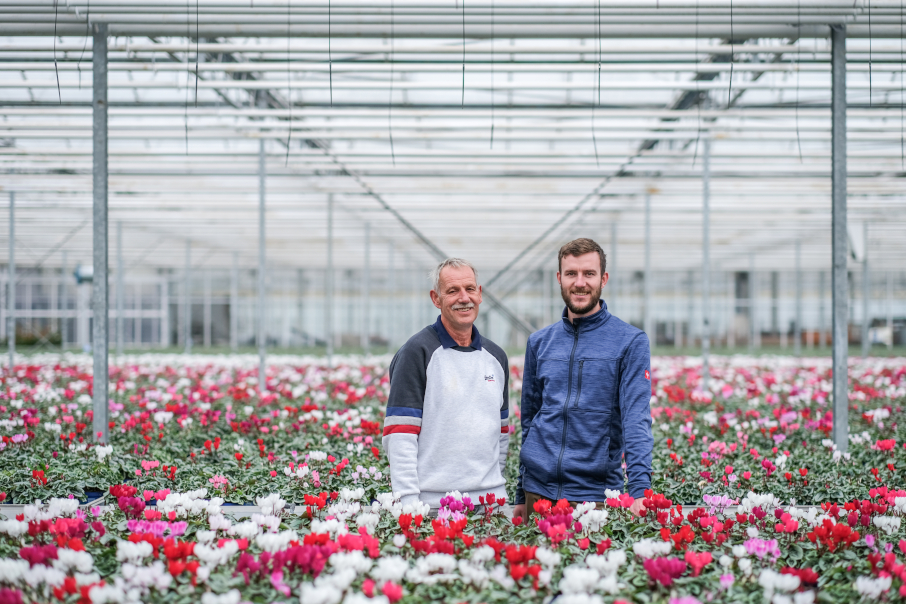 Dass Alpenveilchen für Garten und Balkon im Trend liegen, bestätigt auch Erzeuger André Ripkens. Er leitet in dritter Generation gemeinsam mit seinem Vater Wolfgang Ripkens den gleichnamigen Straelener Topfpflanzenbetrieb. Alpenveilchen sind seit mehr als 35 Jahren ein fester Bestandteil des Produktsortiments. „Wir haben uns auf Cyclamen spezialisiert, die vor allem für Blumenbeete und Balkonkästen gezüchtet wurden. Pro Jahr vermarkten wir unter unserer eigenen Marke ©Out-Land von Ende Juni bis Ende Januar rund 400.000 dieser Outdoorpflanzen in 11er und 7er-Töpfen“, erklärt André Ripkens. „Klassisches Weiß läuft immer sehr gut, bei den anderen Farben ändert sich das im Verlauf der Saison. Aktuell sind zum Beispiel Rottöne sehr gefragt. Aber auch zweifarbige Blüten in Lila mit weißem Rand sind in diesem Jahr deutlich besser gelaufen als sonst.“ Jeden Farbtrend kann man natürlich nicht mitmachen, wie André Ripkens betont: „Wir setzen daher auf eine gute Mischung aus hellen und dunklen Blüten, die wir bei unseren Jungpflanzenlieferanten selbst zusammenstellen. Denn auch innerhalb einer Farbe gibt es Nuancen, die sich mehr oder weniger gut für den Outdooreinsatz eignen. Und unser wichtigstes Ziel ist es immer, den Kunden unabhängig von der Farbe eine unkomplizierte, robuste Gartenpflanze in guter Qualität zu bieten.“