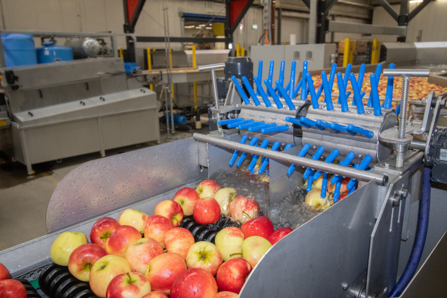 Das in der Wasserentleerungs-Anlage genutzte Wasser wird durch integrierte Filter- und UV-Technik nachhaltig aufbereitet. Eine moderne Trocknung sorgt dafür, dass die Früchte sauber und trocken in die Weiterverarbeitung gelangen. Mit einer Kapazität von bis zu 60 Großkisten pro Stunde – das entspricht 18.000 Kilogramm – setzt die neue Anlage Maßstäbe. Ein integrierter Palettierer steigert die Effizienz der Anlage zusätzlich.