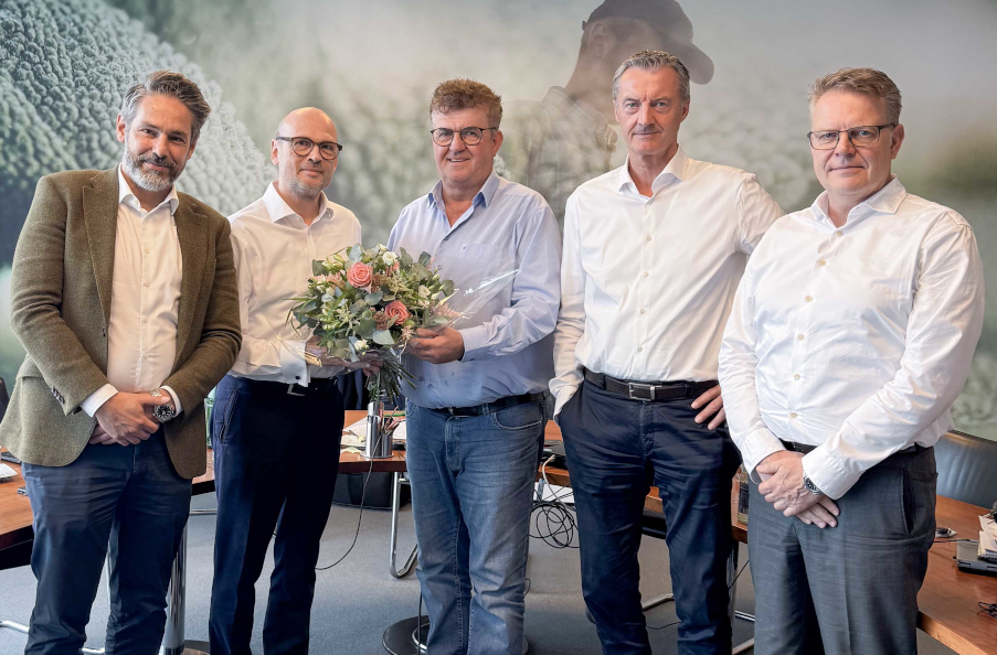 v.l.: Moritz Krannich (Vorstand Landgard eG), Dr. Gunther Lehleiter (Mitglied des Aufsichtsrates Landgard eG), Bert Schmitz (Aufsichtsratsvorsitzender Landgard eG), Roland Neuwald (Vorstand Landgard eG) und Dr. Carsten Nagel (CRO)