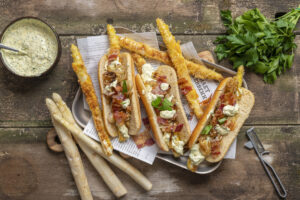 Hot Dog mit knusprigem Spargel und Kräuter-Hollandaise