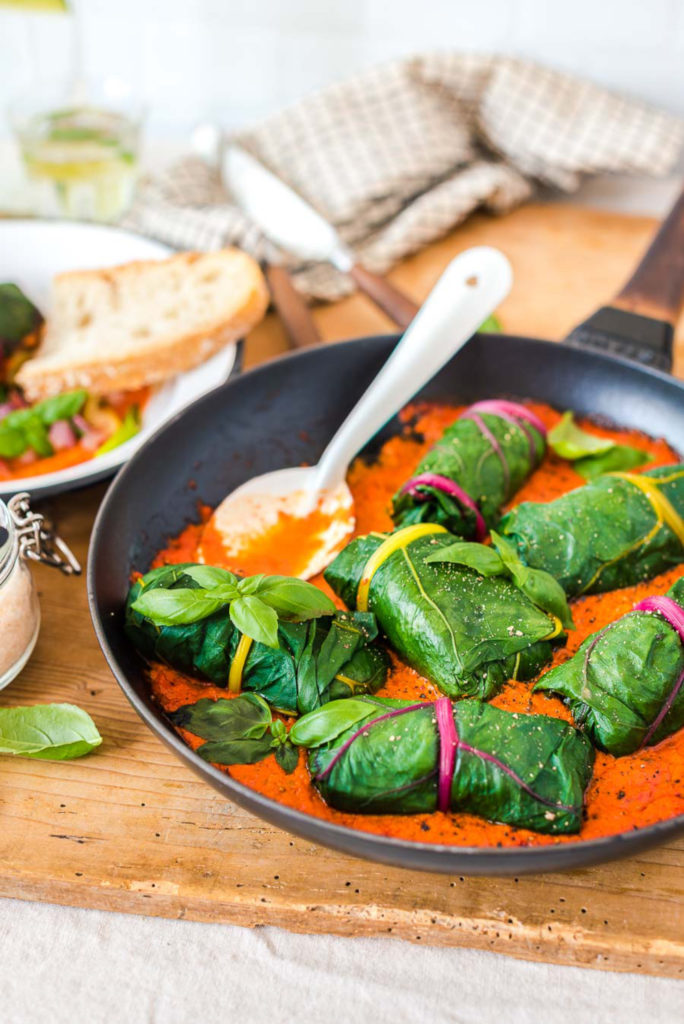 Die Sauce in eine Auflaufform füllen. Mangold-Rouladen darauf verteilen und alles im Backofen für ca. 15 Minuten garen.